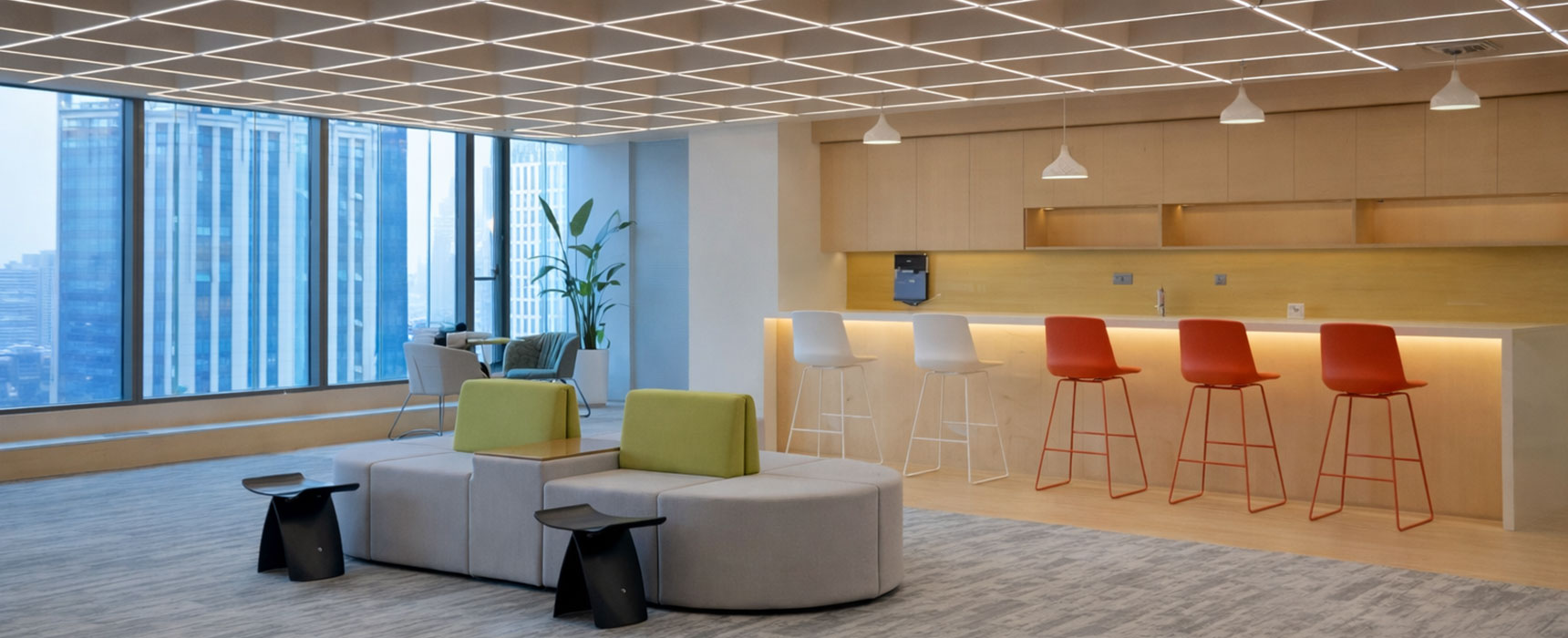 ออกแบบผนังหลังเคาน์เตอร์ตกแต่งด้วยหินอ่อนและจอภาพมัลติมีเดีย ช่วยเสริมภาพลักษณ์แบรนด์ เราจัดการงานโครงสร้างสำหรับฝ้าเพดานสูง ระบบไฟเซนเซอร์อัตโนมัติ และการเชื่อมต่อระบบ Digital Door Lock เพื่อให้ผู้มาเยือนและพนักงานรู้สึกประทับใจตั้งแต่ก้าวแรก